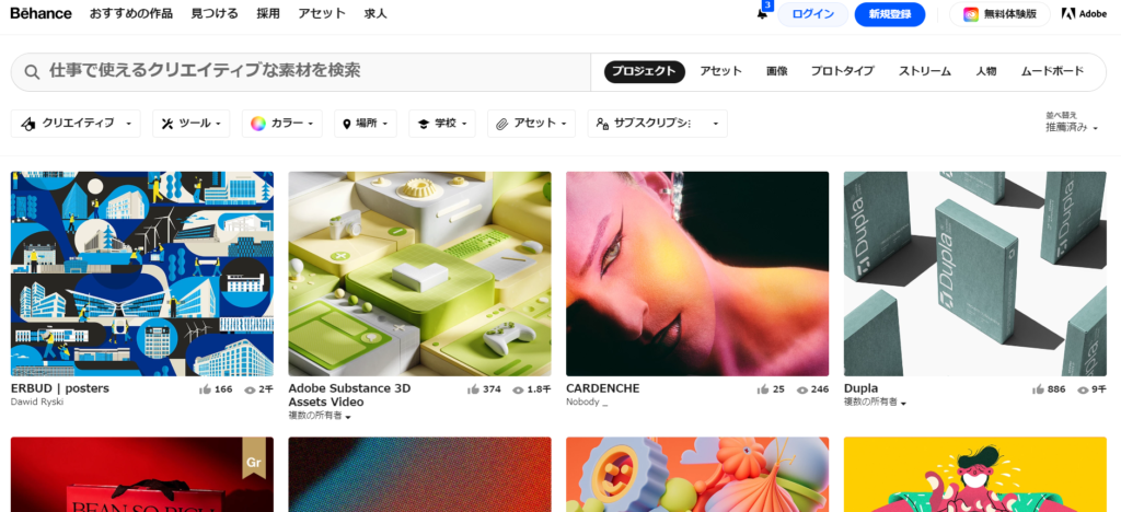 Behanceは、多岐にわたるクリエイティブフィールドからの作品を展示するプラットフォームとして広く認知されています。ウェブデザイン分野でも、その斬新なアプローチと国際的な視点から、幅広いスタイルとアイディアに触れることができます。